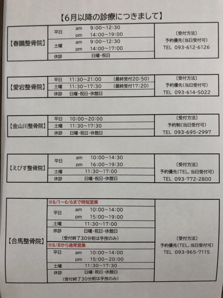 この度、5月は感染防止対策としてスポーツガーデンフェニックスの短縮営業に伴い、整骨院グループも時短診療を続けておりました。