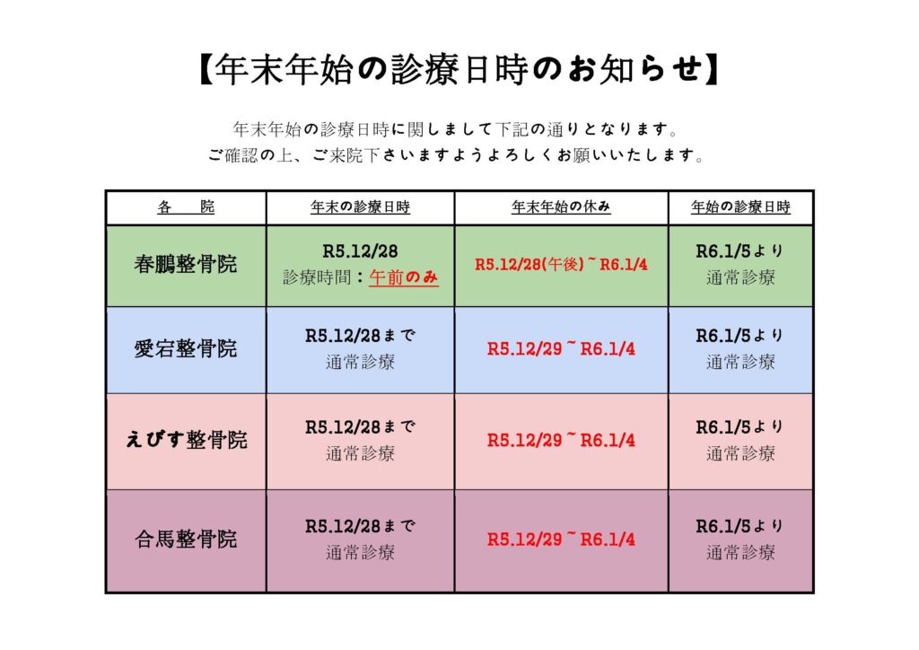 お知らせ 年末年始の診療日時につきまして 折園整骨院グループ 2023年12月02日 年末年始の診療日時に関しまして下記の通りとなります。ご確認の上、ご来院下さいますようよろしくお願いいたします。 PDFファイルで確認する « 前の記事へ お知らせ一覧に戻る 次の記事へ »