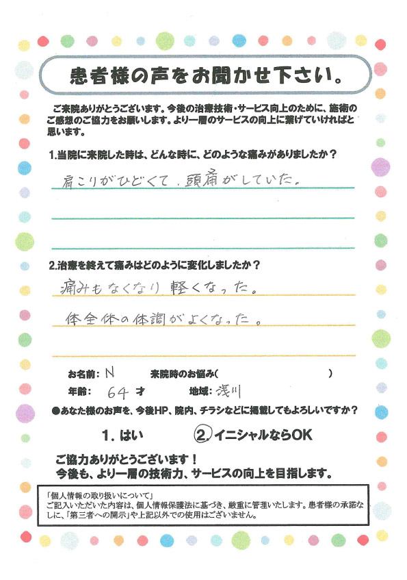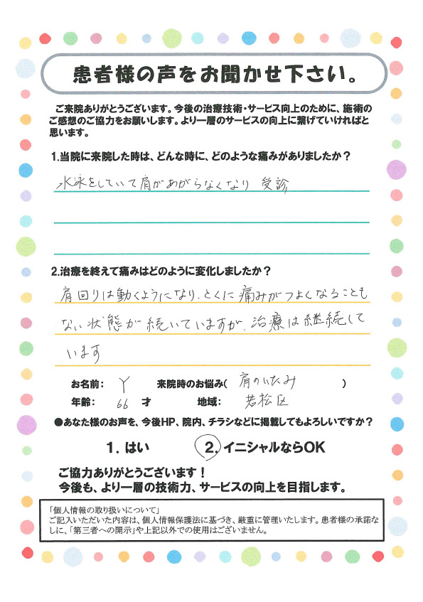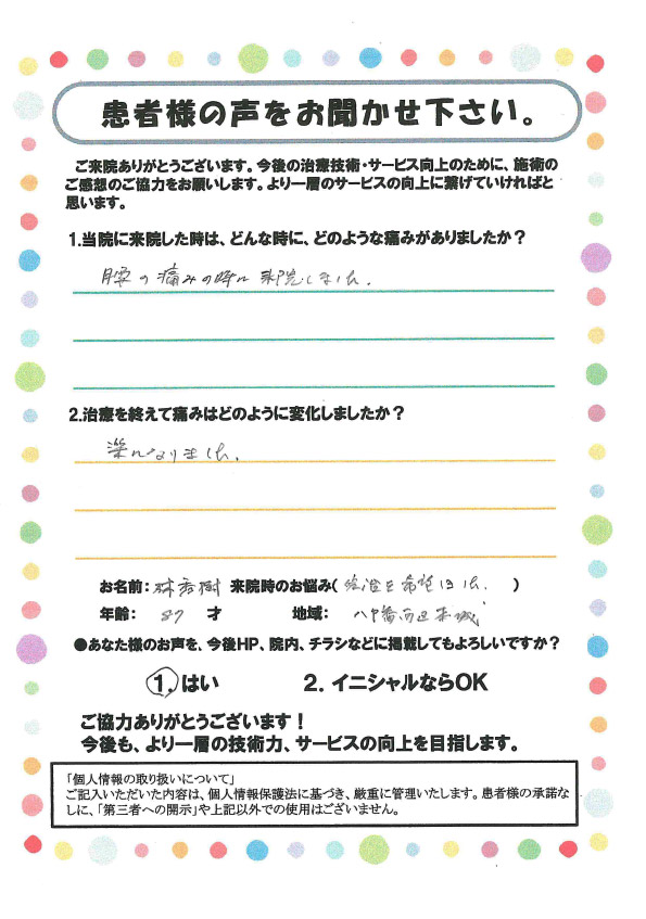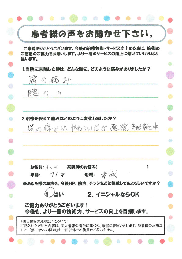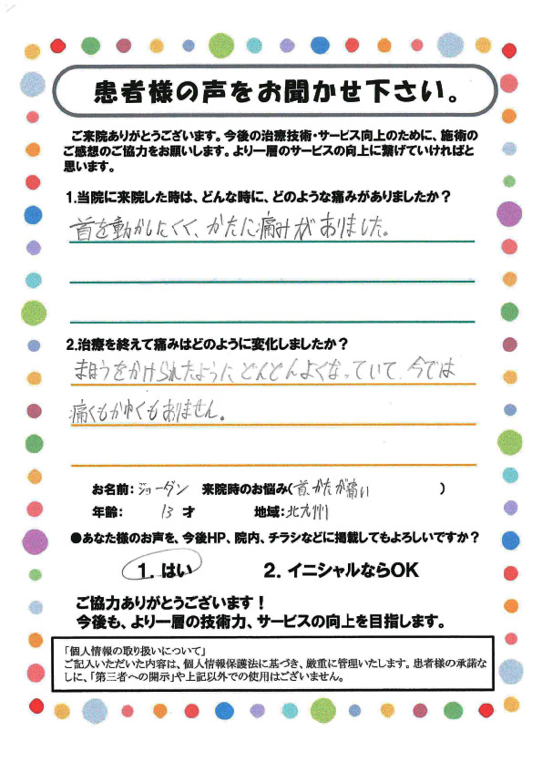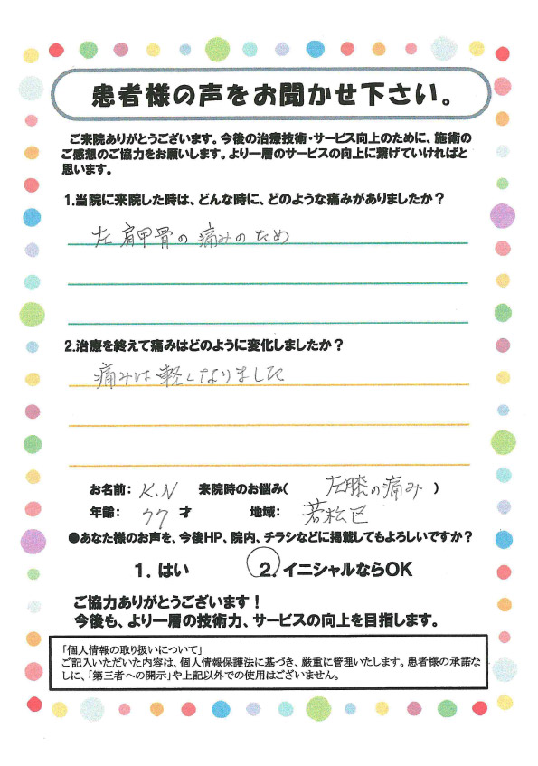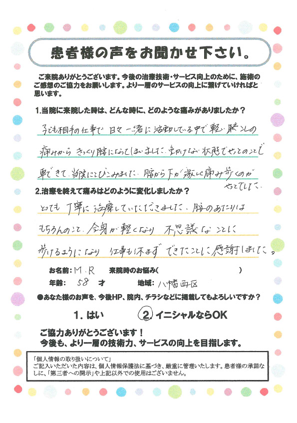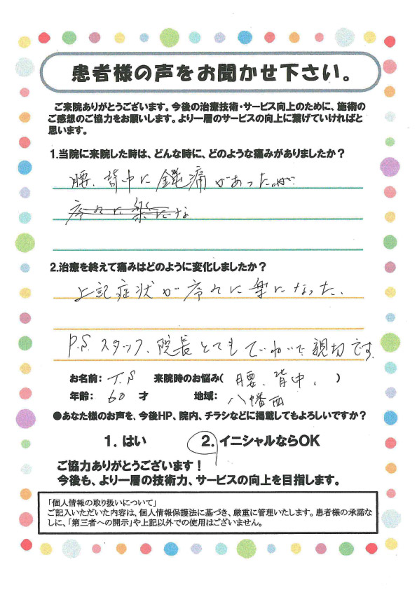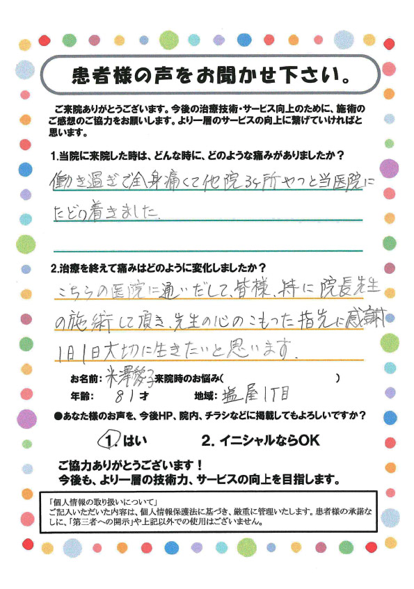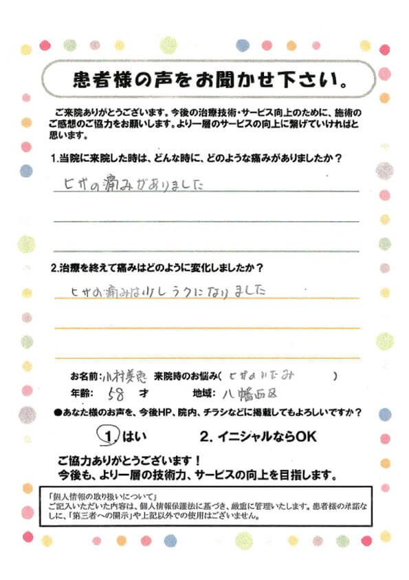 患者様の声 一覧 ヒザの痛みは少しラクになりました。 お名前 小村 美恵 様 ご年齢 58 才 地域 八幡西区 来院時のお悩み ヒザのいたみ 1.当院に来院した時は、どんな時に、どのような痛みがありましたか? ヒザの痛みがありました。 2.治療を終えて痛みはどのように変化しましたか? ヒザの痛みは少しラクになりました。 スタッフ、院長とてもていねいで親切です。 お名前 T.S 様 ご年齢 60 才 地域 八幡西区 来院時のお悩み 腰.背中 1.当院に来院した時は、どんな時に、どのような痛みがありましたか? 腰、背中に鈍痛があった 2.治療を終えて痛みはどのように変化しましたか? 上記症状が徐々に楽になった。 P.S スタッフ、院長とてもていねいで親切です。 仕事も休まずできたことに感謝しました。 お名前 M.R 様 ご年齢 58 才 地域 八幡西区 来院時のお悩み 未記入 1.当院に来院した時は、どんな時に、どのような痛みがありましたか? 子ども相手の仕事で、日々一緒に活動している中で軽い腰の痛みからぎっくり腰になってしまいました。動けない状態でやっとのことで車で来て、当院に飛び込みました。腰から下が激しく痛み歩くのがやっとでした。 2.治療を終えて痛みはどのように変化しましたか? とても丁寧に治療していただきました。腰のあたりはもちろんのこと、全身が軽くなり、不思議なことに歩けるようになり、仕事も休まずできたことに感謝しました。 今では痛くもかゆくもありません。 お名前 ジョーダン 様 ご年齢 13 才 地域 北九州市 来院時のお悩み 首、肩が痛い 1.当院に来院した時は、どんな時に、どのような痛みがありましたか? 首を動かしにくく、肩に痛みがありました。 2.治療を終えて痛みはどのように変化しましたか? まほうをかけられたように、どんどん良くなっていて、今では痛くもかゆくもありません。 楽になりました。 お名前 林 秀樹 様 ご年齢 87 才 地域 八幡西区本城 来院時のお悩み 完治を希望しました 1.当院に来院した時は、どんな時に、どのような痛みがありましたか? 腰の痛みの時に来院しました。 2.治療を終えて痛みはどのように変化しましたか? 楽になりました。 先生の心のこもった指先に感謝。 お名前 米澤 愛子 様 ご年齢 81 才 地域 塩屋1丁目 来院時のお悩み 未記入 1.当院に来院した時は、どんな時に、どのような痛みがありましたか? 働き過ぎで全身痛くて、他院3か所やっと当医院にたどり着きました。 2.治療を終えて痛みはどのように変化しましたか? こちらの医院に通いだして、皆様、特に院長先生の施術していただき、先生の心のこもった指先に感謝。1日1日大切に生きたいと思います。 肩の痛みはやわらいだが、通院継続中 お名前 小田 様 ご年齢 71 才 地域 本城 来院時のお悩み 未記入 1.当院に来院した時は、どんな時に、どのような痛みがありましたか? 肩の痛み腰の痛み 2.治療を終えて痛みはどのように変化しましたか? 肩の痛みはやわらいだが、通院継続中 痛みは軽くなりました お名前 K.N 様 ご年齢 77 才 地域 若松区 来院時のお悩み 左膝の痛み 1.当院に来院した時は、どんな時に、どのような痛みがありましたか? 左肩甲骨の痛みのため 2.治療を終えて痛みはどのように変化しましたか? 痛みは軽くなりました とくに痛みがつよくなることもない状態が続いています お名前 Y 様 ご年齢 66 才 地域 若松区 来院時のお悩み 肩のいたみ 1.当院に来院した時は、どんな時に、どのような痛みがありましたか? 水泳をしていて肩があがらなくなり受診 2.治療を終えて痛みはどのように変化しましたか? 肩回りは動くようになり、とくに痛みがつよくなることもない状態が続いていますが、治療は継続しています。 体全体の体調がよくなった。 お名前 N 様 ご年齢 64 才 地域 浅川 来院時のお悩み 未記入 1.当院に来院した時は、どんな時に、どのような痛みがありましたか? 肩こりがひどくて、頭痛がしていた。 2.治療を終えて痛みはどのように変化しましたか? 痛みもなくなり軽くなった。 体全体の体調がよくなった。 « 先頭 « ... 3 4 »